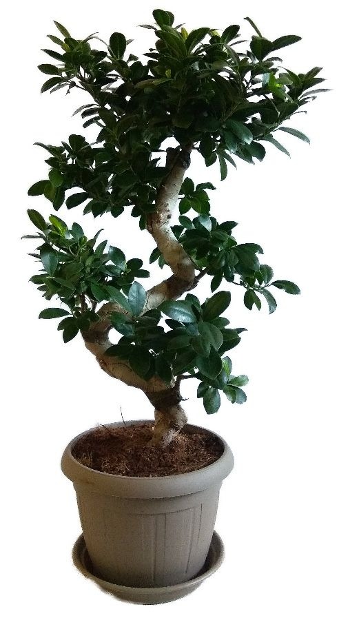 Ficusy ginseng sú izbové bonsaje, ktoré nevyžadujú žiadnu starostlivosť, zálievka je veľmi sporadická raz za čas po celkovom vyschnutí. Výška izbovej bonsaje je 76 cm vrátane kvetináča a priemer misky 25 cm. Originálne foto.