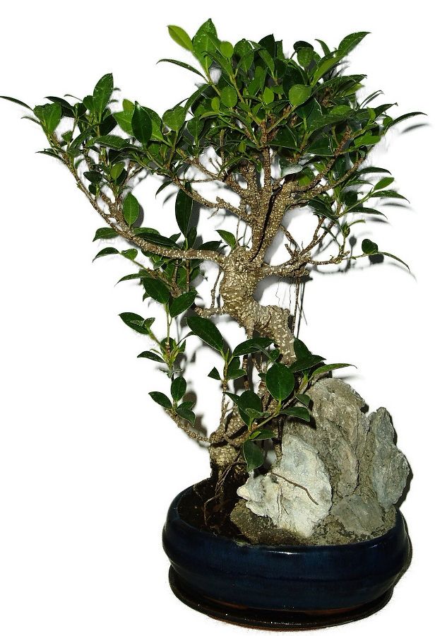Ficus retusa - figovník je klasická izbová bonsaje o výške stromu 44 cm a veku 10 rokov. Stačí im polotieň, či šero, iba neznáša prievan a studenú vodu.