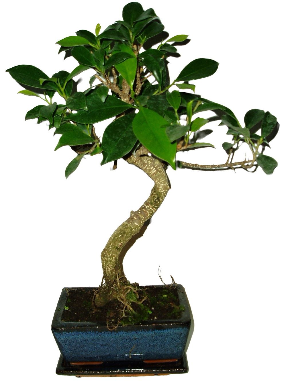 Ficus retusa - figovník je klasická izbová bonsai s výškou stromu 39 cm a vek 6 rokov. Stačí im polotieň, či šero, iba neznáša prievan a studenú vodu.