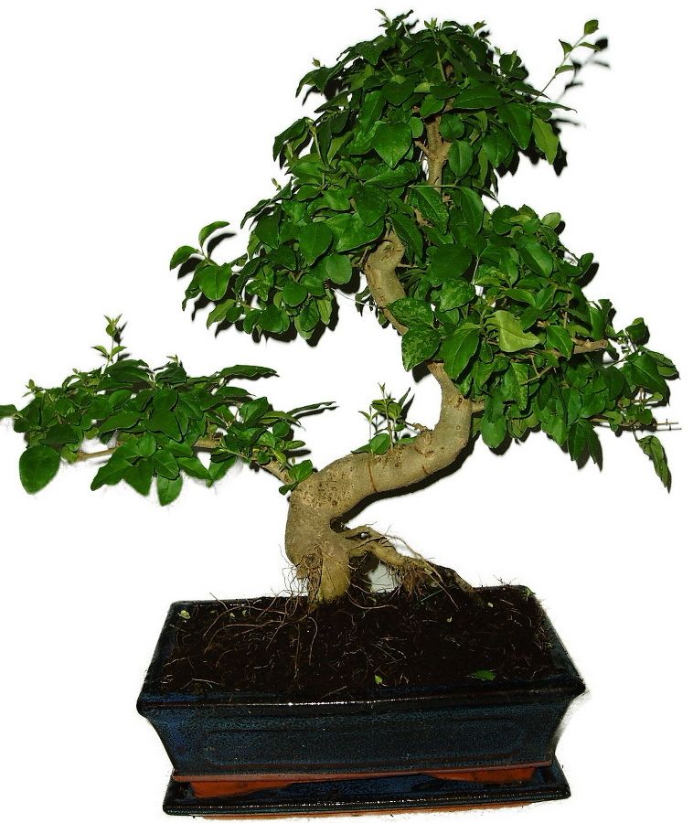 Bonsaj Ligustrum Chinensis, známa aj ako vtáčí zob čínsky, je obľúbená pre svoje lesklé zelené listy a schopnosť produkovať atraktívne biele kvety. Výška bonsaje 44 cm, výška, vek bonsaje 10 rokov.