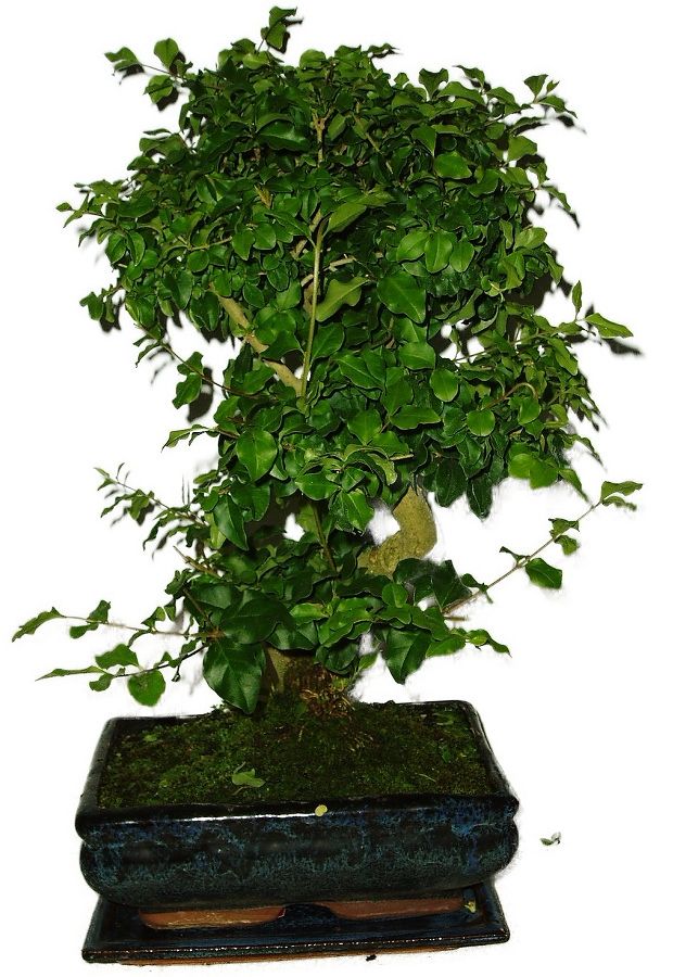 Bonsaj Ligustrum Chinensis, známa aj ako vtáčí zob čínsky, je obľúbená pre svoje lesklé zelené listy a schopnosť produkovať atraktívne biele kvety. Výška bonsaje 38 cm, vek bonsaje 8 rokov.