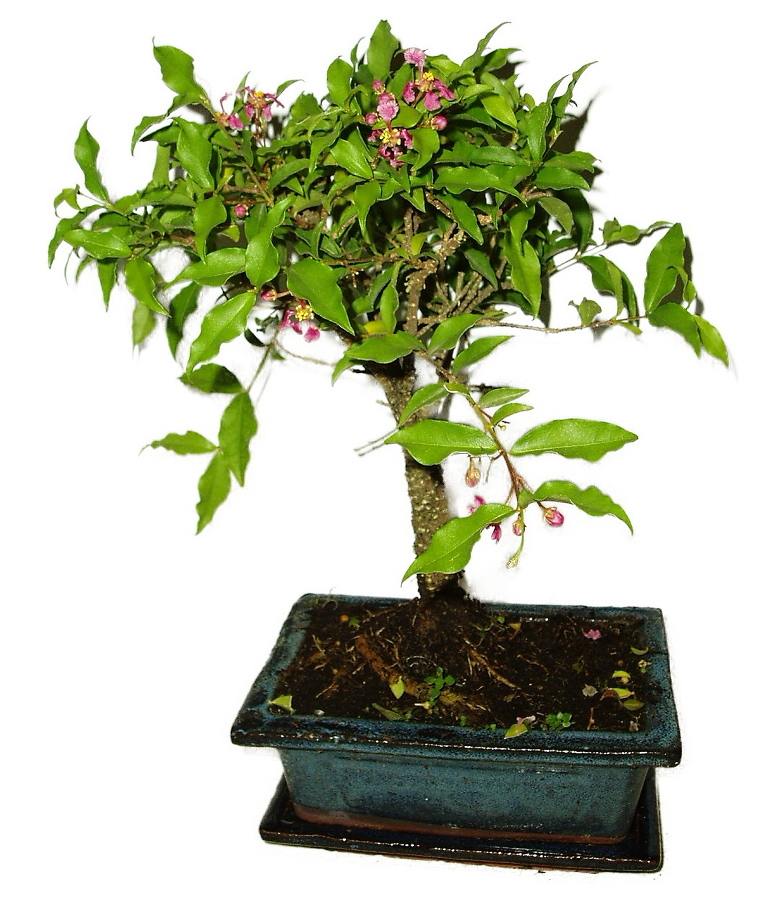 Raritné bonsai kvitnúce krásnymi ružovými kvetmi a plodiace šarlátovo červené plody. Výška bonsaje 28 cm a vek 6 rokov.
