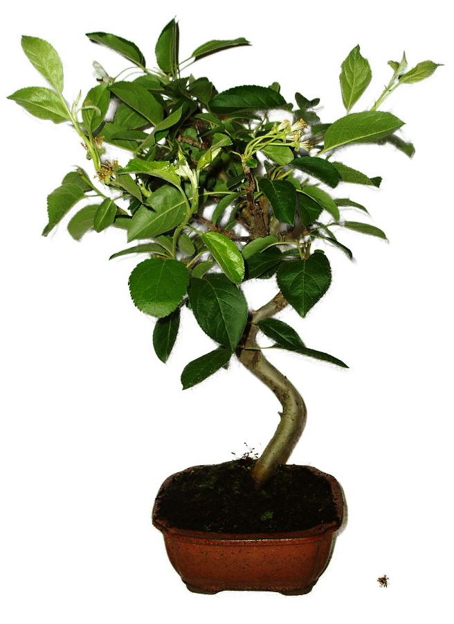 Malus - krásna čerešňoplodá jabloň, ideálna do všetkých záhrad, kde je život. Záhradu obohatí svojim krásnym kvetom a plodom. Plody sú výrazne červené. Pri nedostatočnej zálievke zvesia listy. Hnojenie dvakrát do mesiaca. Jednoducho sa tvarujú nové výhonky, než zdrevnatie. Pokiaľ máte radi farby a pekné záhrady originálne, neváhajte. Pohľad je vždy úchvatný na plodiaci bonsai.